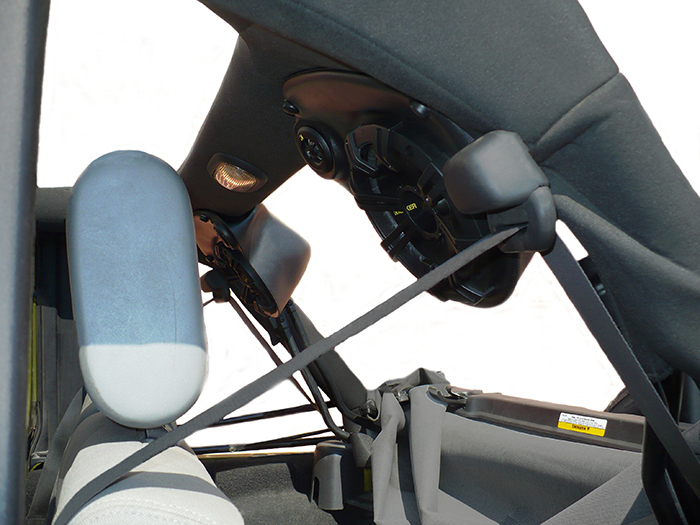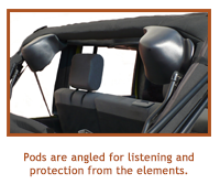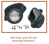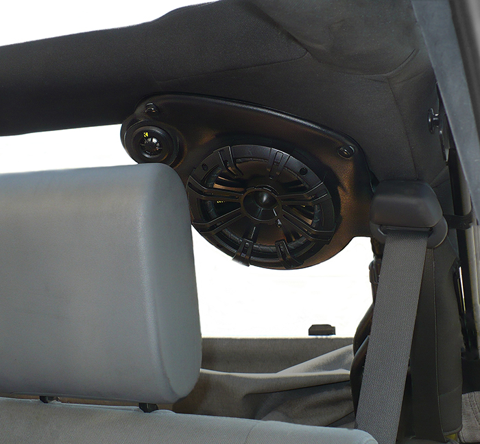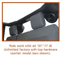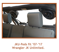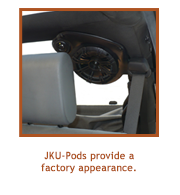 JKU-Pods mount easily to the factory sport cage with included specialty screws. No modifications are needed because the pods mount directly over the cloth and padding. Each pod has a concealed wire-lead hole to hide speaker wires as they exit the pod and slip under the roll bar cover.
