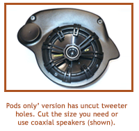 Version 1: The pods and mounting hardware only. You supply your own speakers, amplifier, wiring and connectors. The pods will arrive with the tweeter holes uncut, allowing you to cut the correct sized holes for your specific component tweeters, or leave them uncut to use coaxial speakers without separate tweeters.